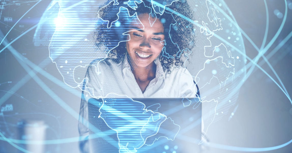 Person typing laptop computer digital world overlay